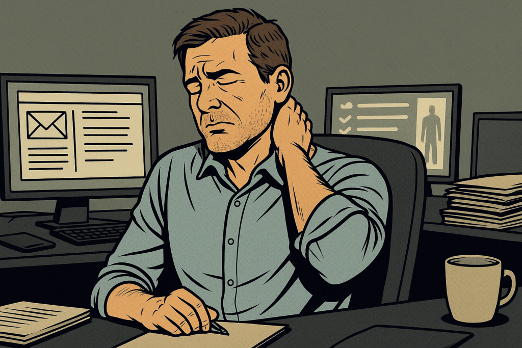 たとえば、長時間のデスクワークで首や肩の筋膜が硬直すると、迷走神経(副交感神経を促す神経)が働きにくくなります。