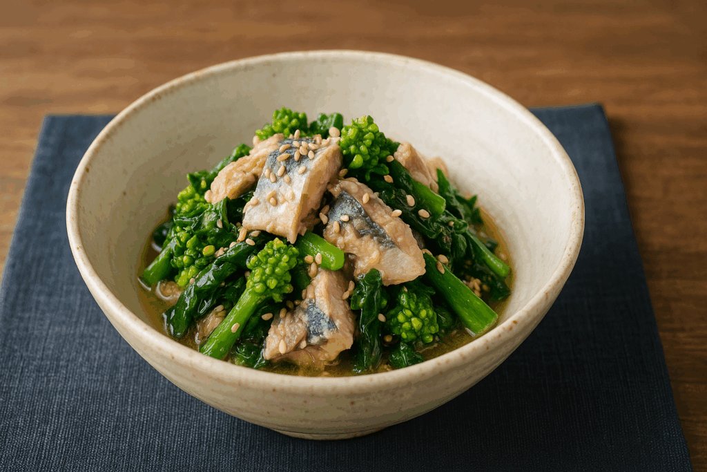 さっと茹でた菜の花と、開けてすぐ使えるサバ缶を使ったこの一皿は、