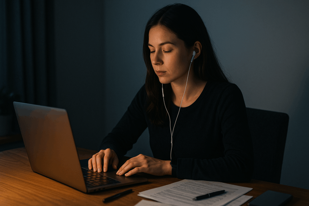 忙しい自営業者が、視覚・聴覚・触覚を意識して五感を再起動し、神経伝達のバランスを整えている様子